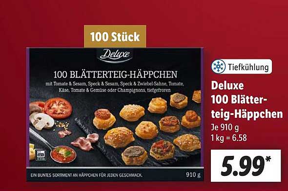 Sehen Sie sich das Deluxe 100 Blätterteig-Häppchen Angebot bei Lidl an! Dieses fantastische Angebot ist jetzt im neuesten Lidl Prospekt verfügbar. Nutzen Sie diese Chance und sparen Sie viel bei Ihrem Einkauf.