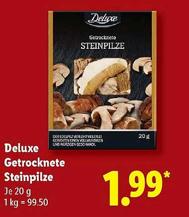 Sehen Sie sich jetzt das Deluxe Getrocknete Steinpilze Angebot im Lidl Prospekt an. Dieses Angebot ist gültig von 06.10.2025 bis 11.10.2025.