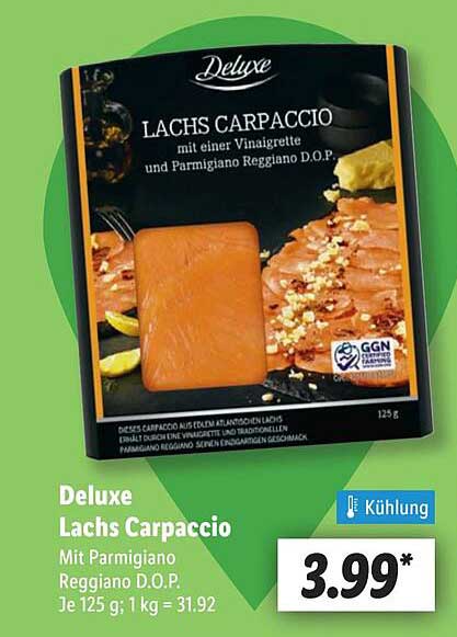 Sehen Sie sich jetzt das Deluxe Lachs Carpaccio mit Vinaigrette und Parmigiano Reggiano D.O.P. Angebot im Lidl Prospekt an. Dieses Angebot ist gültig von 14.04.2025 bis 20.04.2025.