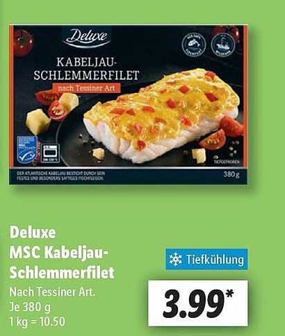Sehen Sie sich jetzt das Deluxe MSC Kabeljau-Schlemmerfilet nach Tessiner Art Angebot im Lidl Prospekt an. Dieses Angebot ist gültig von 31.03.2025 bis 05.04.2025.