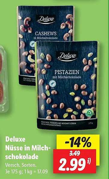 Sehen Sie sich jetzt das Deluxe Nüsse in Milchschokolade - Pistazien und Cashews Angebot im Lidl Prospekt an. Dieses Angebot ist gültig von 31.03.2025 bis 05.04.2025.