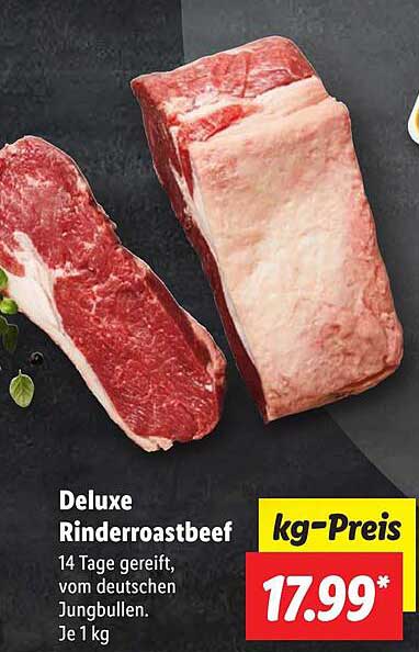 Sehen Sie sich jetzt das Deluxe Rinderroastbeef Angebot im Lidl Prospekt an. Dieses Angebot ist gültig von 25.11.2024 bis 30.11.2024.