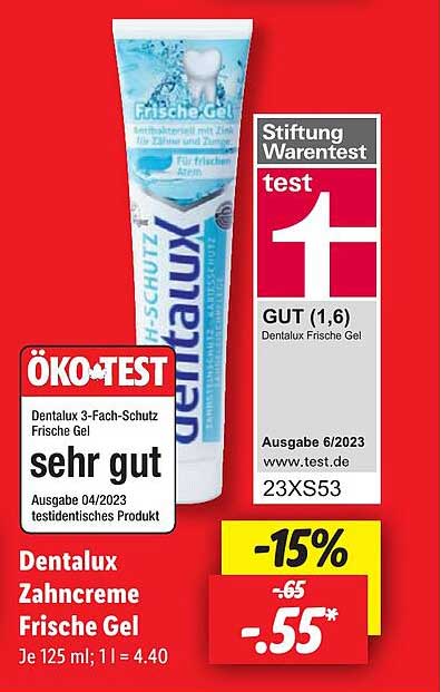Sehen Sie sich das Dentalux Zahnpasta Frische Gel Angebot bei Lidl an! Dieses fantastische Angebot ist jetzt im neuesten Lidl Prospekt verfügbar. Nutzen Sie diese Chance und sparen Sie viel bei Ihrem Einkauf.