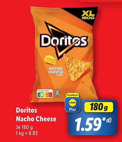 Sehen Sie sich das Doritos Nacho Cheese Angebot bei Lidl an! Dieses fantastische Angebot ist jetzt im neuesten Lidl Prospekt verfügbar. Nutzen Sie diese Chance und sparen Sie viel bei Ihrem Einkauf.