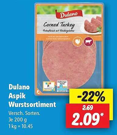 Sehen Sie sich jetzt das Dulano Aspik Wurstsortiment - Corned Turkey Angebot im Lidl Prospekt an. Dieses Angebot ist gültig von 31.03.2025 bis 05.04.2025.