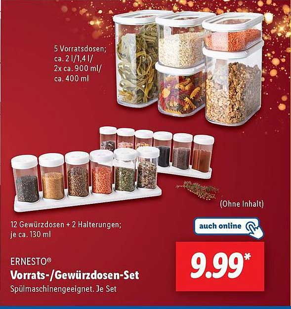Entdecken Sie das großartige Ernesto® Vorrats-/Gewürzdosen-Set Angebot im neuesten Lidl Prospekt. Neben diesem Angebot finden Sie noch viele weitere attraktive Rabatte. Sie können das Ernesto® Vorrats-/Gewürzdosen-Set einfach online über die Lidl Website bestellen oder in einem Geschäft in Ihrer Nähe kaufen.