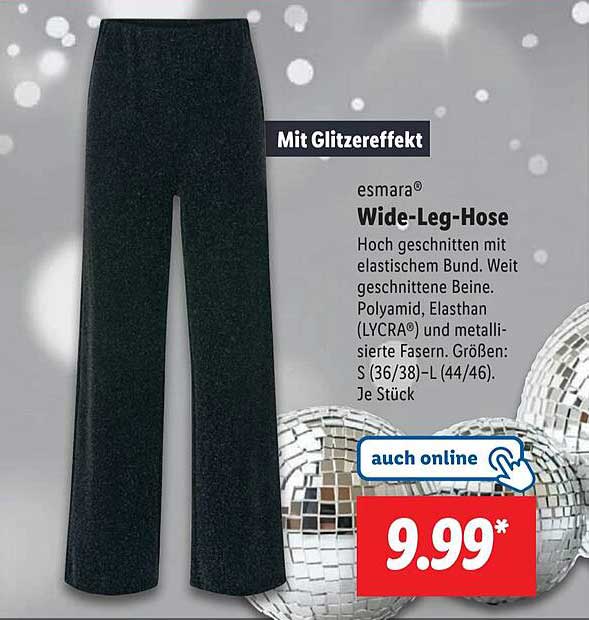 Entdecken Sie das großartige Esmara® Wide-Leg-Hose Angebot im neuesten Lidl Prospekt. Neben diesem Angebot finden Sie noch viele weitere attraktive Rabatte. Sie können das Esmara® Wide-Leg-Hose einfach online über die Lidl Website bestellen oder in einem Geschäft in Ihrer Nähe kaufen.