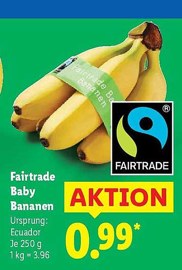 Sehen Sie sich jetzt das Fairtrade Baby Bananen 250 g Angebot im Lidl Prospekt an. Dieses Angebot ist gültig von 22.09.2025 bis 28.09.2025.