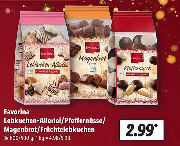 Sehen Sie sich das Favorina Lebkuchen-Allerlei/Pfeffernüsse/Magenbrot/Früchtelebkuchen Angebot bei Lidl an! Dieses fantastische Angebot ist jetzt im neuesten Lidl Prospekt verfügbar. Nutzen Sie diese Chance und sparen Sie viel bei Ihrem Einkauf.