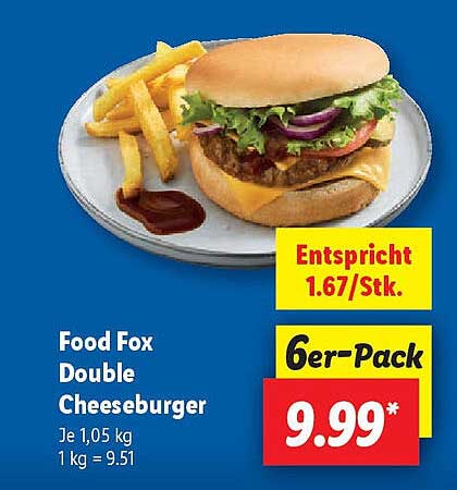 Sehen Sie sich jetzt das Food Fox Double Cheeseburger 6er-Pack Angebot im Lidl Prospekt an. Dieses Angebot ist gültig von 01.06.2025 bis 07.06.2025.