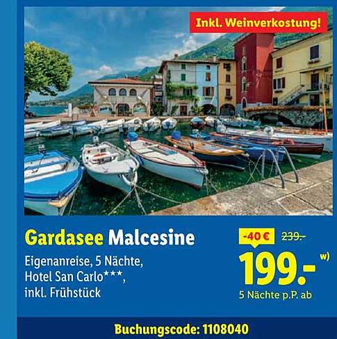 Sehen Sie sich jetzt das Gardasee Malcesine: 5 Nächte im Hotel San Carlo*** inkl. Frühstück Angebot im Lidl Prospekt an. Dieses Angebot ist gültig von 22.09.2025 bis 28.09.2025.