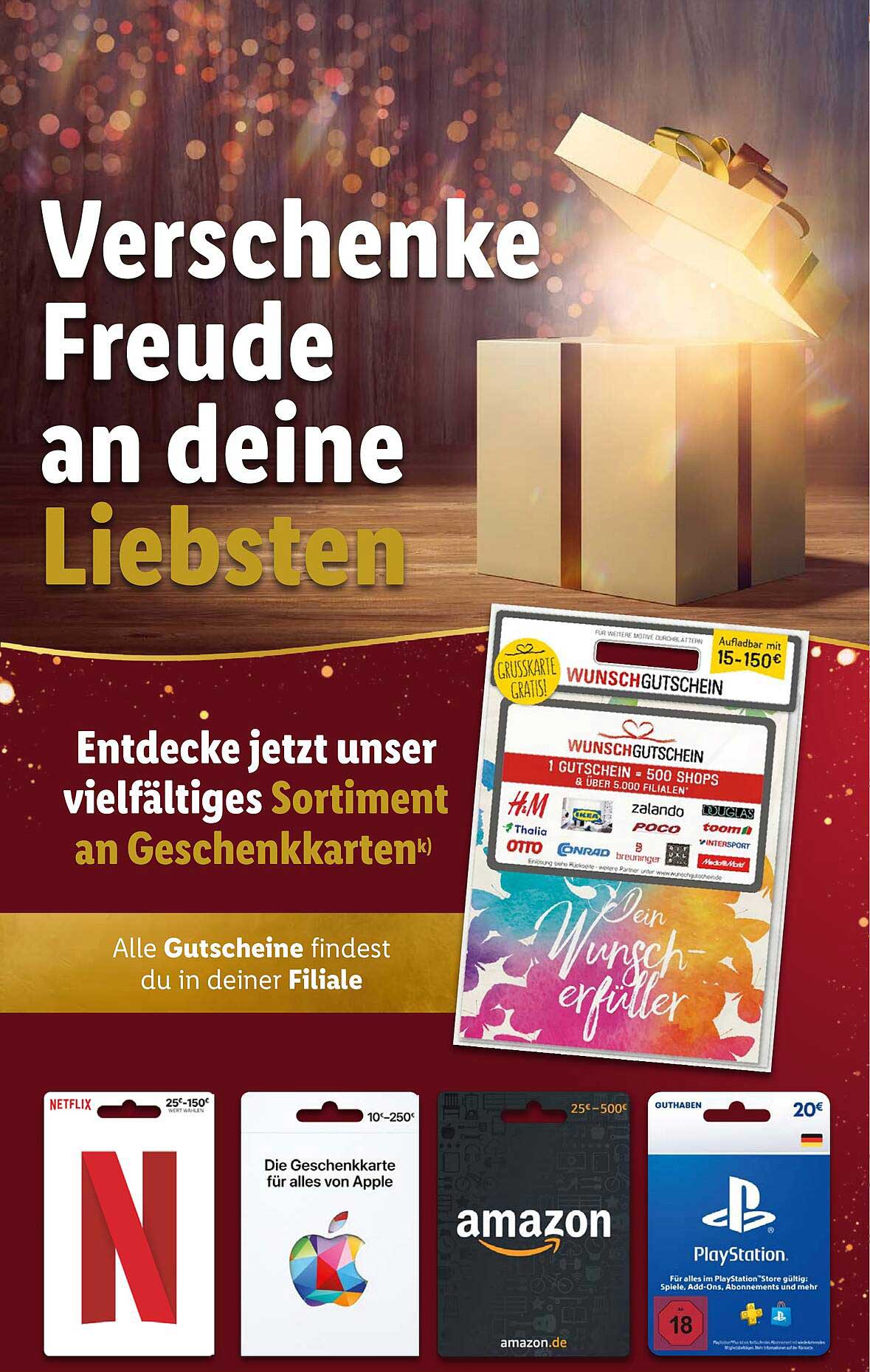 Sehen Sie sich jetzt das Geschenkkarten Angebot im Lidl Prospekt an. Dieses Angebot ist gültig von 18.11.2024 bis 24.11.2024.
