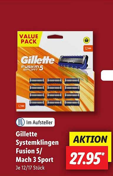 Sehen Sie sich das Gillette Systemklingen Fusion 5/ Mach 3 Sport Angebot bei Lidl an! Dieses fantastische Angebot ist jetzt im neuesten Lidl Prospekt verfügbar. Nutzen Sie diese Chance und sparen Sie viel bei Ihrem Einkauf.
