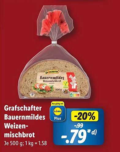 Sehen Sie sich das Grafschafter Bauernmildes Weizenmischbrot Angebot bei Lidl an! Dieses fantastische Angebot ist jetzt im neuesten Lidl Prospekt verfügbar. Nutzen Sie diese Chance und sparen Sie viel bei Ihrem Einkauf.