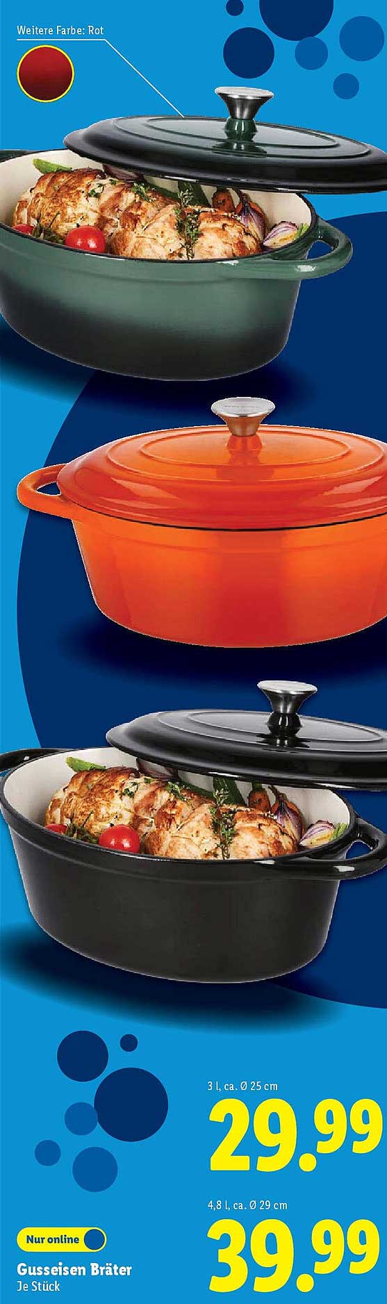 Sehen Sie sich jetzt das Gusseisen Bräter - Je Stück für 29,99 bzw. 39,99 Angebot im Lidl Prospekt an. Dieses Angebot ist gültig von 27.10.2025 bis 01.11.2025.