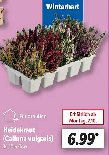 Sehen Sie sich das Heidekraut (Calluna Vulgaris) Angebot bei Lidl an! Dieses fantastische Angebot ist jetzt im neuesten Lidl Prospekt verfügbar. Nutzen Sie diese Chance und sparen Sie viel bei Ihrem Einkauf.