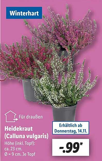 Sehen Sie sich das Heidekraut (Calluna Vulgaris) Angebot bei Lidl an! Dieses fantastische Angebot ist jetzt im neuesten Lidl Prospekt verfügbar. Nutzen Sie diese Chance und sparen Sie viel bei Ihrem Einkauf.