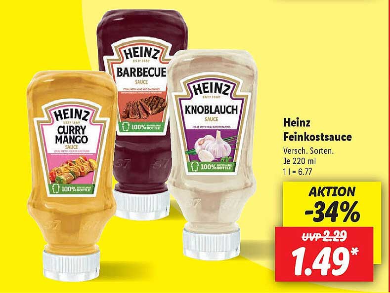 Entdecken Sie das großartige Heinz Feinkostsauce Angebot im neuesten Lidl Prospekt. Neben diesem Angebot finden Sie noch viele weitere attraktive Rabatte. Sie können das Heinz Feinkostsauce einfach online über die Lidl Website bestellen oder in einem Geschäft in Ihrer Nähe kaufen.