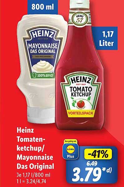 Sehen Sie sich jetzt das Heinz Tomatenketchup/Mayonnaise Das Original Angebot im Lidl Prospekt an. Dieses Angebot ist gültig von 09.09.2024 bis 14.09.2024.