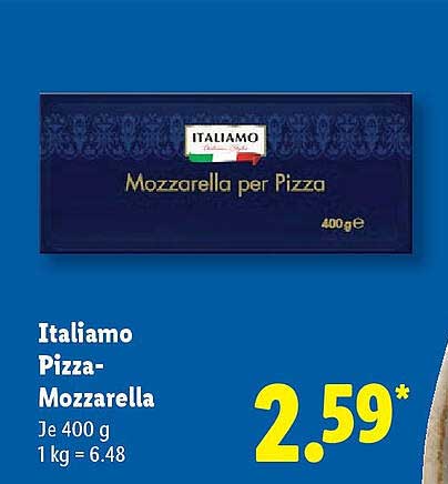 Sehen Sie sich jetzt das Italamo Pizza-Mozzarella 400 g Angebot im Lidl Prospekt an. Dieses Angebot ist gültig von 22.09.2025 bis 28.09.2025.