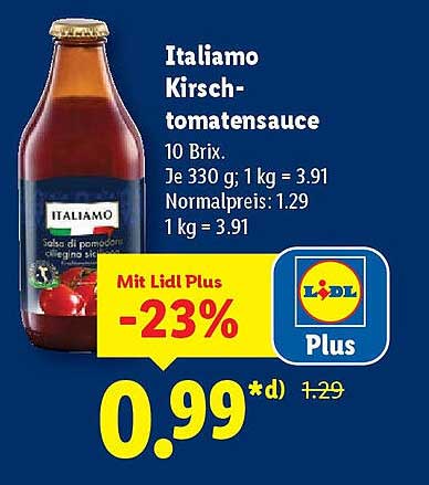 Sehen Sie sich jetzt das Italiamo Kirsch-Tomatensauce Angebot im Lidl Prospekt an. Dieses Angebot ist gültig von 22.09.2025 bis 28.09.2025.