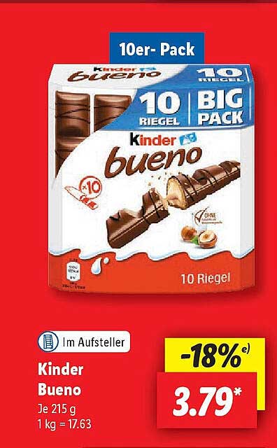 Entdecken Sie das großartige Kinder Bueno Angebot im neuesten Lidl Prospekt. Neben diesem Angebot finden Sie noch viele weitere attraktive Rabatte. Sie können das Kinder Bueno einfach online über die Lidl Website bestellen oder in einem Geschäft in Ihrer Nähe kaufen.