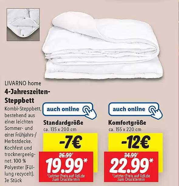 Sehen Sie sich das Livarno Home 4-Jahreszeiten-Steppbett Angebot bei Lidl an! Dieses fantastische Angebot ist jetzt im neuesten Lidl Prospekt verfügbar. Nutzen Sie diese Chance und sparen Sie viel bei Ihrem Einkauf.