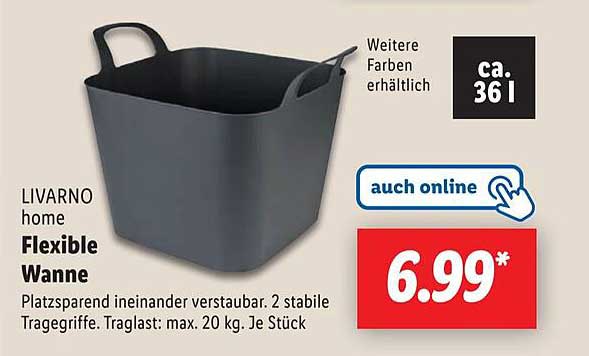 Entdecken Sie das großartige Livarno Home Flexible Wanne Angebot im neuesten Lidl Prospekt. Neben diesem Angebot finden Sie noch viele weitere attraktive Rabatte. Sie können das Livarno Home Flexible Wanne einfach online über die Lidl Website bestellen oder in einem Geschäft in Ihrer Nähe kaufen.