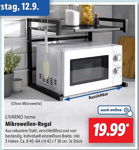 Sehen Sie sich jetzt das LIVARNO home Mikrowellen-Regal Angebot im Lidl Prospekt an. Dieses Angebot ist gültig von 09.09.2024 bis 14.09.2024.