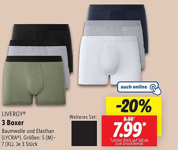 Sehen Sie sich das Livergy® 3 Boxer Angebot bei Lidl an! Dieses fantastische Angebot ist jetzt im neuesten Lidl Prospekt verfügbar. Nutzen Sie diese Chance und sparen Sie viel bei Ihrem Einkauf.