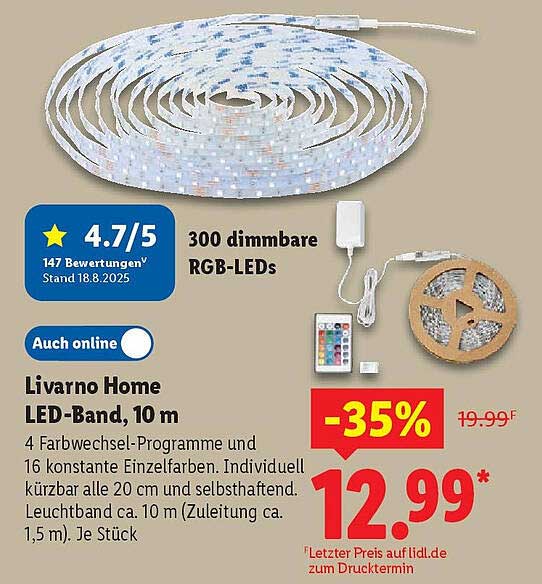 Im aktuellen Lidl-Prospekt wird das Livorno Home LED-Band mit einem attraktiven Rabatt von 35 % angeboten. Statt des regulären Preises von 19,99 € zahlen Sie nur 12,99 €. Das macht es zu einem hervorragenden Schnäppchen, wenn Sie auf der Suche nach hochwertiger und attraktiver Beleuchtung sind. Nutzen Sie diese Gelegenheit, um Ihr Zuhause zu einem echten Hingucker zu machen!