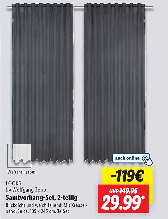 Sehen Sie sich jetzt das LOOKS by Wolfgang Joop Samtvorhang-Set, 2-teilig Angebot im Lidl Prospekt an. Dieses Angebot ist gültig von 21.10.2024 bis 26.10.2024.