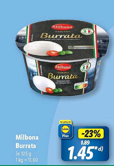 Sehen Sie sich das Milbona Burrata Angebot bei Lidl an! Dieses fantastische Angebot ist jetzt im neuesten Lidl Prospekt verfügbar. Nutzen Sie diese Chance und sparen Sie viel bei Ihrem Einkauf.