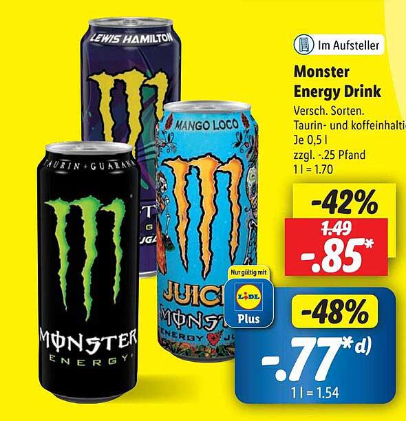 Sehen Sie sich das Monster Energy Drink Angebot bei Lidl an! Dieses fantastische Angebot ist jetzt im neuesten Lidl Prospekt verfügbar. Nutzen Sie diese Chance und sparen Sie viel bei Ihrem Einkauf.