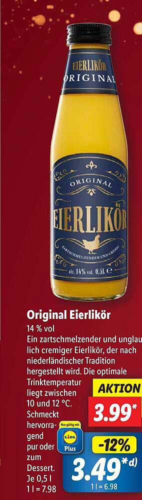 Sehen Sie sich das Original Eierlikör Angebot bei Lidl an! Dieses fantastische Angebot ist jetzt im neuesten Lidl Prospekt verfügbar. Nutzen Sie diese Chance und sparen Sie viel bei Ihrem Einkauf.