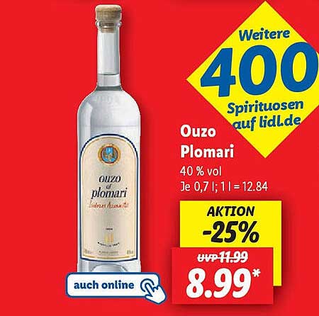 Sehen Sie sich jetzt das Ouzo Plomari 0,7 l - 40 % vol Angebot im Lidl Prospekt an. Dieses Angebot ist gültig von 29.06.2025 bis 05.07.2025.