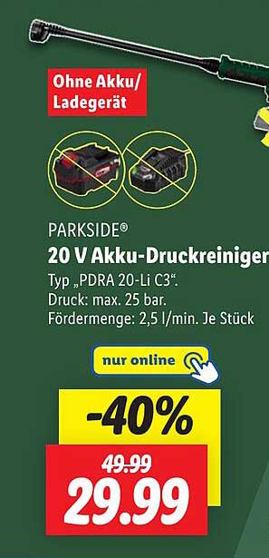 Entdecken Sie das großartige Parkside® 20 V Akku-Druckreiniger Angebot im neuesten Lidl Prospekt. Neben diesem Angebot finden Sie noch viele weitere attraktive Rabatte. Sie können das Parkside® 20 V Akku-Druckreiniger einfach online über die Lidl Website bestellen oder in einem Geschäft in Ihrer Nähe kaufen.