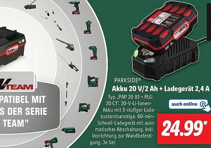 Sehen Sie sich jetzt das PARKSIDE Akku 20 V/2 Ah + Ladegerät 2,4 A Angebot im Lidl Prospekt an. Dieses Angebot ist gültig von 09.09.2024 bis 14.09.2024.