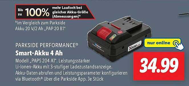 Sehen Sie sich das Parkside Performance® Smart-Akku 4 Ah Angebot bei Lidl an! Dieses fantastische Angebot ist jetzt im neuesten Lidl Prospekt verfügbar. Nutzen Sie diese Chance und sparen Sie viel bei Ihrem Einkauf.