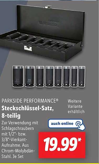 Sehen Sie sich jetzt das PARKSIDE PERFORMANCE® Steckschlüssel-Satz, 8-teilig Angebot im Lidl Prospekt an. Dieses Angebot ist gültig von 23.09.2024 bis 28.09.2024.