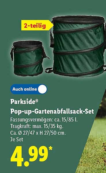 Sehen Sie sich jetzt das Parkside® Pop-up-Gartenabfallsack-Set Angebot im Lidl Prospekt an. Dieses Angebot ist gültig von 22.09.2025 bis 28.09.2025.