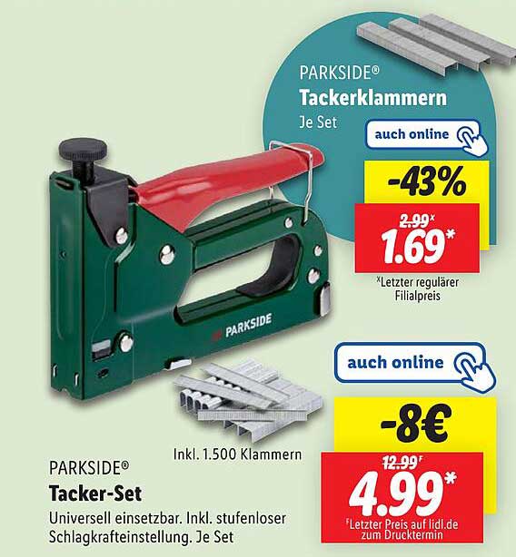 Sehen Sie sich das Parkside® Tacker-Set Angebot bei Lidl an! Dieses fantastische Angebot ist jetzt im neuesten Lidl Prospekt verfügbar. Nutzen Sie diese Chance und sparen Sie viel bei Ihrem Einkauf.