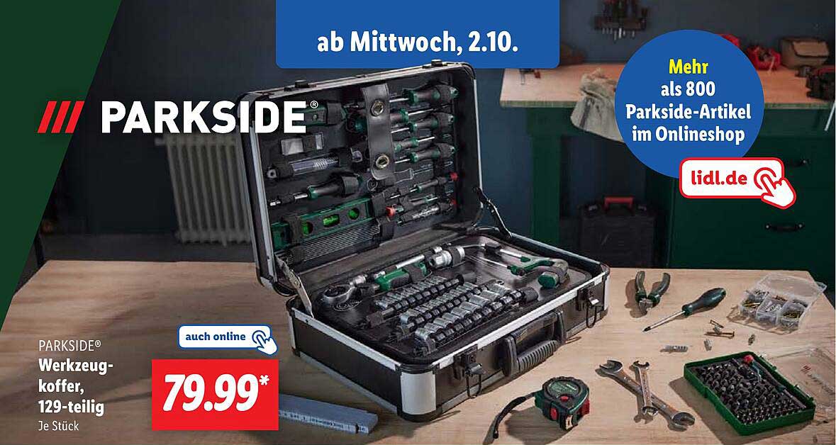 Sehen Sie sich das Parkside® Werkzeugkoffer, 129-Teilig Angebot bei Lidl an! Dieses fantastische Angebot ist jetzt im neuesten Lidl Prospekt verfügbar. Nutzen Sie diese Chance und sparen Sie viel bei Ihrem Einkauf.