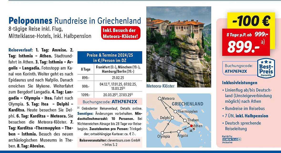 Entdecken Sie das großartige Peloponnes Rundreise In Griechenland Angebot im neuesten Lidl Prospekt. Neben diesem Angebot finden Sie noch viele weitere attraktive Rabatte. Sie können das Peloponnes Rundreise In Griechenland einfach online über die Lidl Website bestellen oder in einem Geschäft in Ihrer Nähe kaufen.
