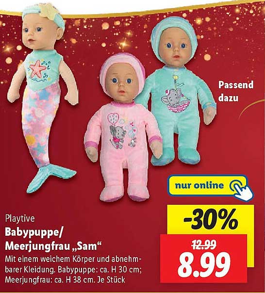 Sehen Sie sich jetzt das Playtive Babypuppe/Meerjungfrau „Sam“ Angebot im Lidl Prospekt an. Dieses Angebot ist gültig von 18.11.2024 bis 24.11.2024.
