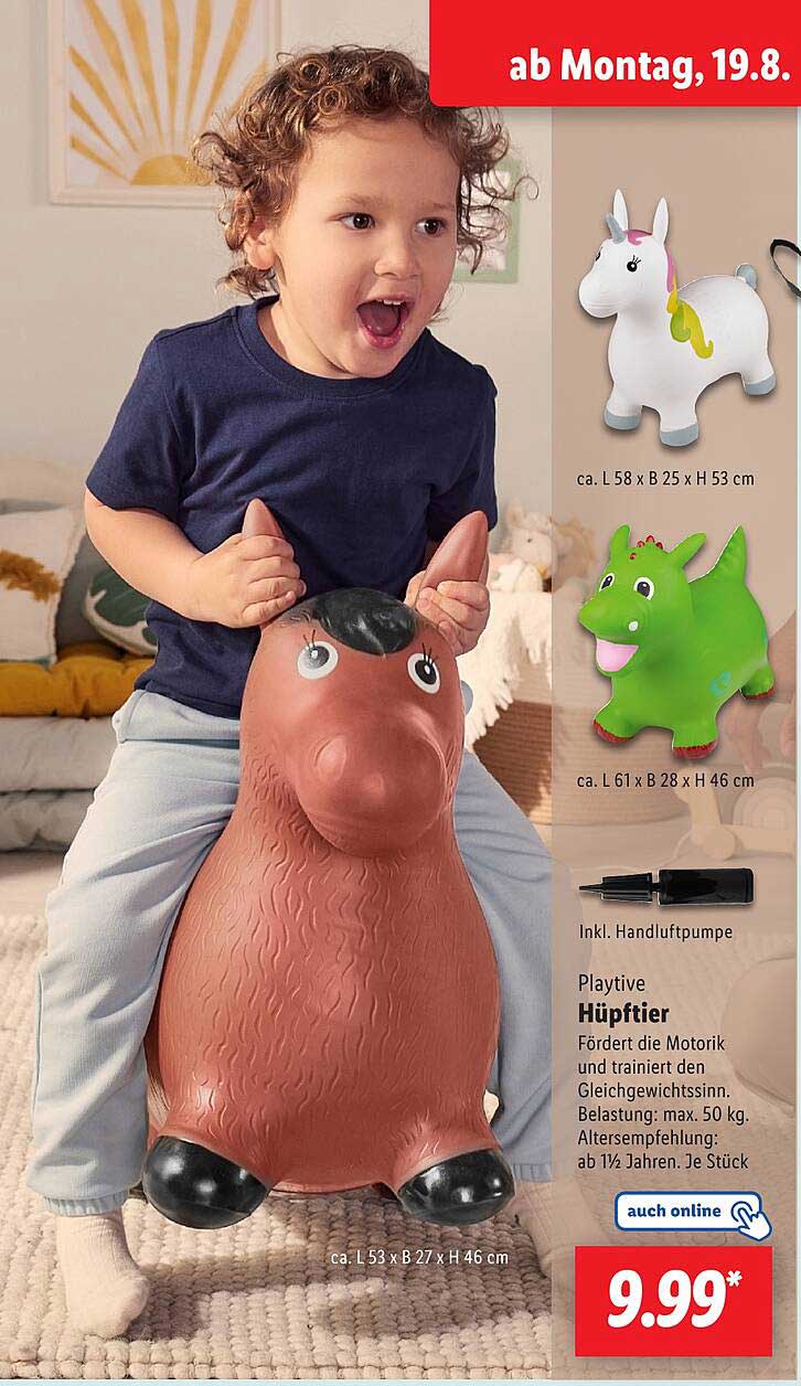 Sehen Sie sich jetzt das Playtive Hüpftier Angebot im Lidl Prospekt an. Dieses Angebot ist gültig von 19.08.2024 bis 24.08.2024.
