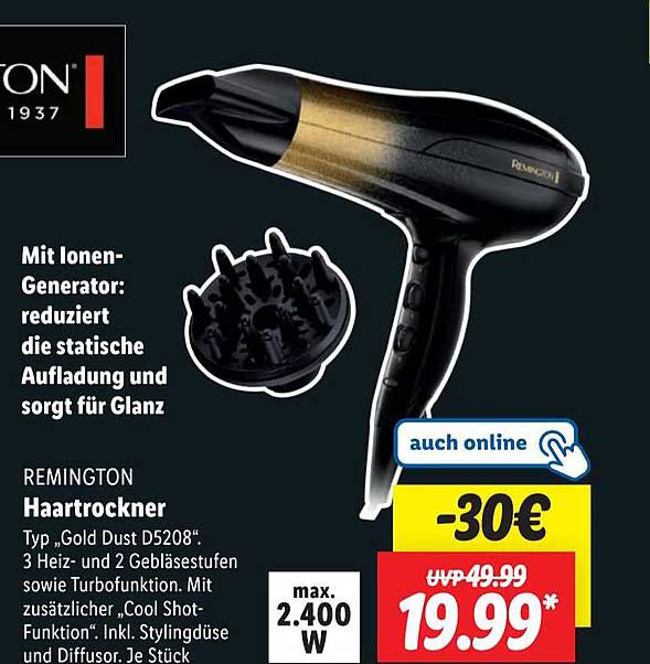 Sehen Sie sich das Remington Haartrockner Angebot bei Lidl an! Dieses fantastische Angebot ist jetzt im neuesten Lidl Prospekt verfügbar. Nutzen Sie diese Chance und sparen Sie viel bei Ihrem Einkauf.