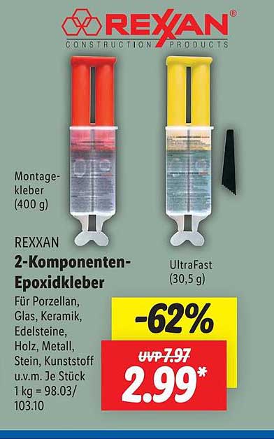 Sehen Sie sich das Rexxan 2-Komponenten-Epoxidkleber Angebot bei Lidl an! Dieses fantastische Angebot ist jetzt im neuesten Lidl Prospekt verfügbar. Nutzen Sie diese Chance und sparen Sie viel bei Ihrem Einkauf.