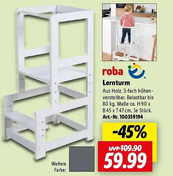 Entdecken Sie das großartige Roba Lernturm Angebot im neuesten Lidl Prospekt. Neben diesem Angebot finden Sie noch viele weitere attraktive Rabatte. Sie können das Roba Lernturm einfach online über die Lidl Website bestellen oder in einem Geschäft in Ihrer Nähe kaufen.