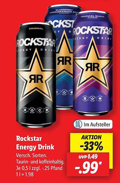 Entdecken Sie das großartige Rockstar Energy Drink Angebot im neuesten Lidl Prospekt. Neben diesem Angebot finden Sie noch viele weitere attraktive Rabatte. Sie können das Rockstar Energy Drink einfach online über die Lidl Website bestellen oder in einem Geschäft in Ihrer Nähe kaufen.